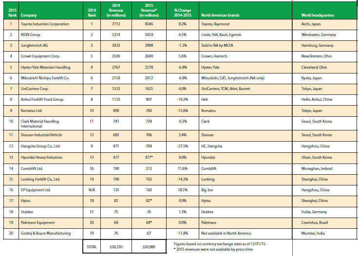- Hytsu không thể báo cáo doanh thu năm 2015 theo thời gian ấn định, nhưng doanh thu năm 2014 của họ đã đủ để đẩy nó lên một bậc xuống vị trí thứ 17. Hubtex, nhà sản xuất xe chuyên dụng Đức, bao gồm cả các xe sideload đa năng điện, động cơ diesel hoặc LPG four- xe tải tiếp nhận, hệ thống vận chuyển thủy tinh, báo cáo thu nhập cấp và hạ cánh ở vị trí thứ 18. Nhà sản xuất của Brazil là Paletrans Equipment, số 19, không thể báo cáo doanh thu theo thời gian. Ở vị trí 20, Godrej & Boyce ở Ấn Độ kiếm được 67 triệu USD doanh thu, giảm 11%.