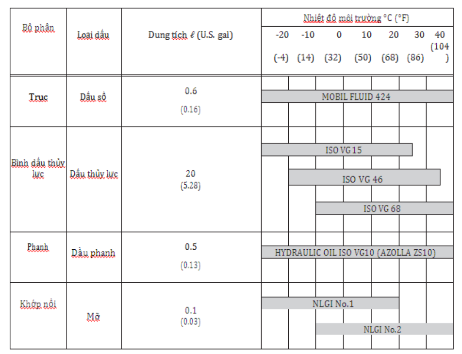 10. Kiểm tra độ an toàn lắp ráp và điều kiện mòn của các bánh và lốp xe. 11. Kiểm tra mức dầu thủy lực trong thùng chứa.