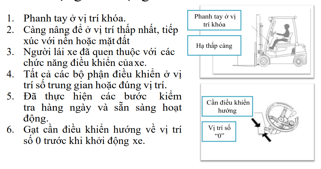 • Kiểm tra xe nâng trước khi hoạt động vào đầu ngày hoặc đầu ca làm việc. Trước khisử dụng xe, kiểm tra hoạt động của tất cả các hệ thống và các thiết bị điều khiển.