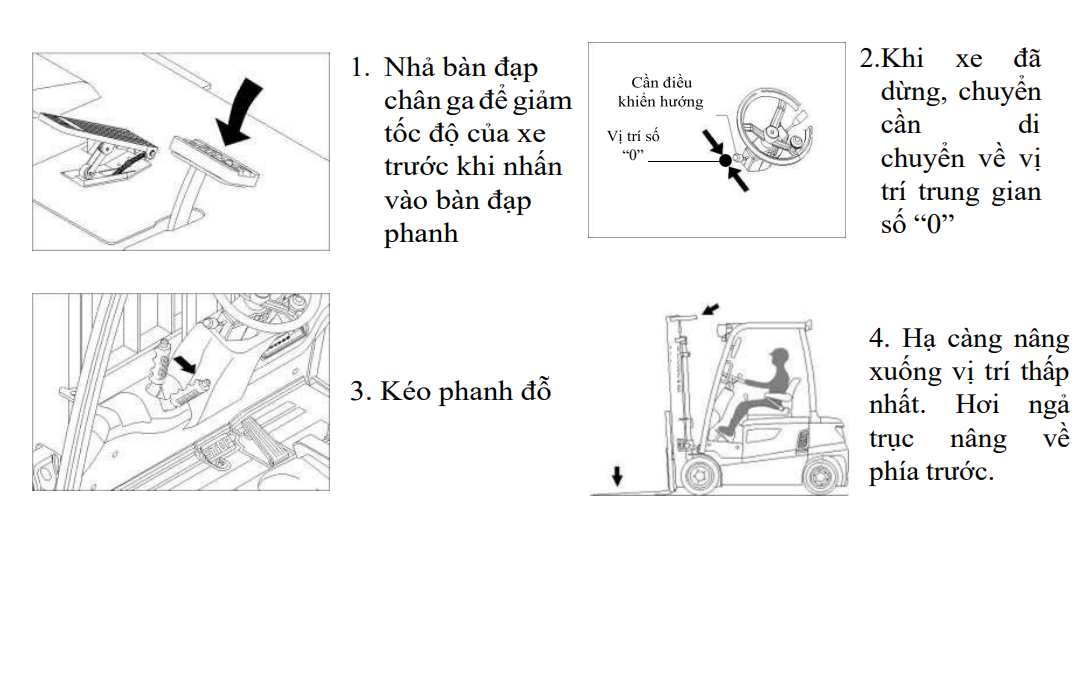 • Hạ bộ phận nâng hạ, càng nâng hoặc bộ phận đi kèm xuống mặt đất.