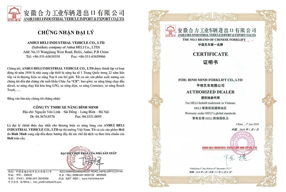 Vào cuối năm 2012, Công ty xe nâng Bình Minh (tiền thân là công ty xe nâng Việt Nam) đã kí một bản hợp đồng ghi nhớ với Anhui Heli tại Anhui, Trung Quốc. Kể từ đó, xe nâng Bình Minh trở thành đại lý bán xe nâng Heli tại Việt Nam cho tới nay đảm nhiệm việc phân phối và bảo hành xe nâng Heli trên toàn quốc.