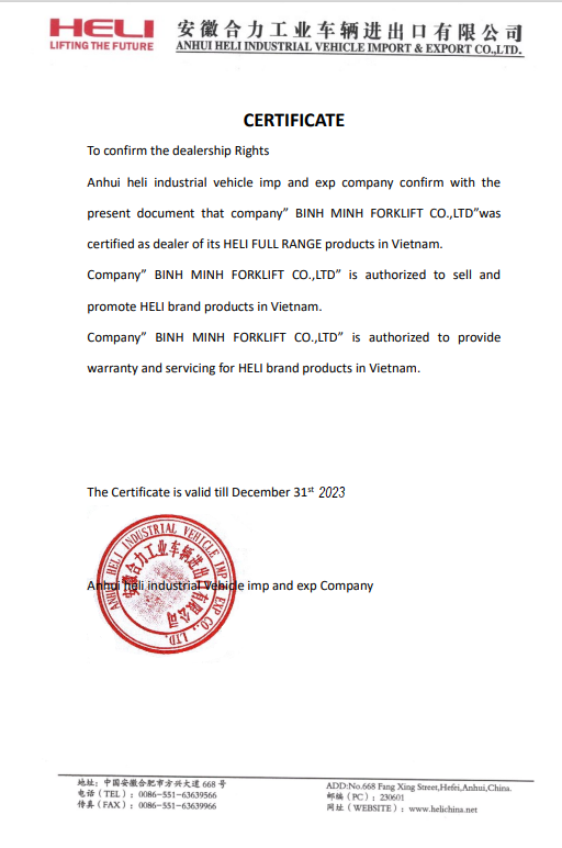Giấy chứng nhận đại lý chính hãng xe nâng Heli cùng xenangtrungquoc.vn năm 2023