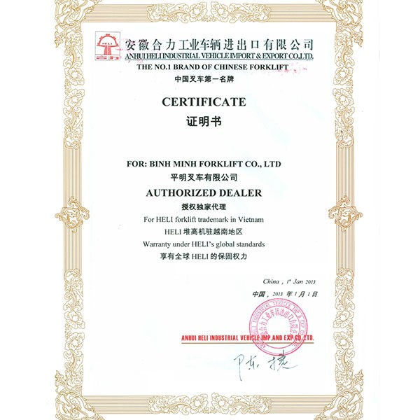 Giấy chứng nhận đại lý chính hãng xe nâng Heli cùng xenangtrungquoc.vn năm 2013