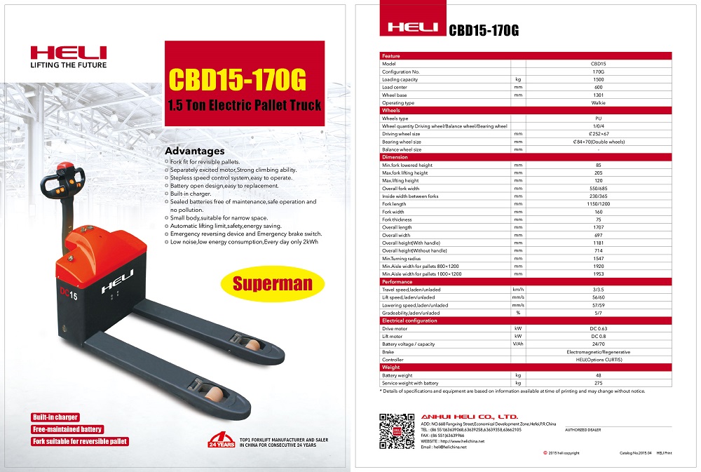 Xe nâng tay điện mini Heli 1,5 tấn model CBD15-170G là dòng xe nâng điện tay thấp, đi bộ lái tự động được sử dụng phổ biến ở Việt Nam thay thế các dòng xe nâng tay cơ khí. Việc sử dụng năng lượng từ acqui cho mọi quá trình nâng hạ, di chuyển giúp cho người sử dụng vận hành nhanh hơn, tiện lợi hơn và mang lại giá trị kinh tế cao hơn. "Giá bán của một chiếc xe nâng tay điện mini từ 38.000.000 đồng tới 45.000.000 đồng tùy theo từng model cụ thể".