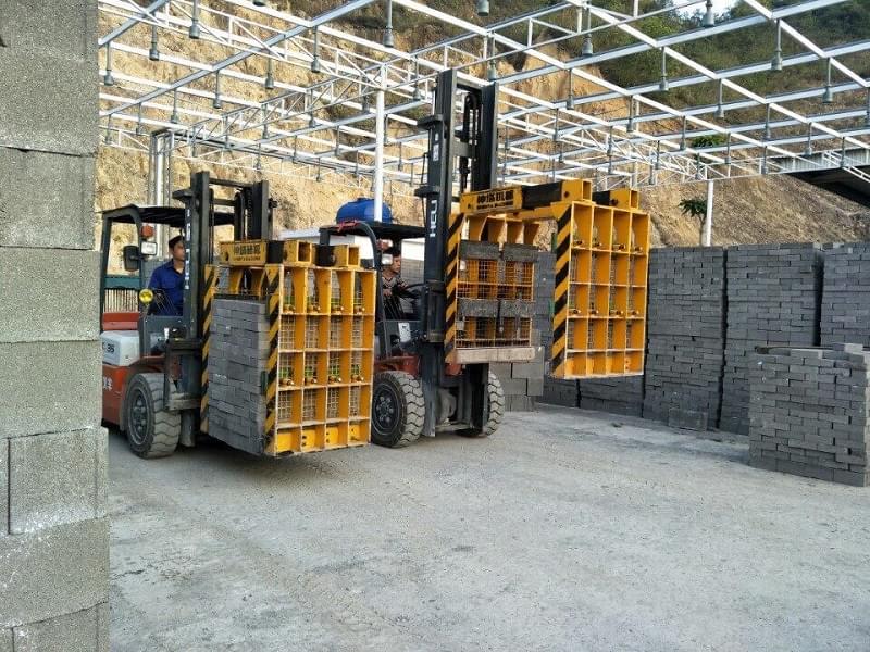 Bộ đôi xe nâng kẹp gạch tại hệ thống nhà máy gạch không nung lớn hàng đầu Việt Nam tại Quảng Ninh do tập đoàn indevco đầu tư công nghệ và dây truyền sản xuất hoàn toàn tự động, xếp gạch bằng robot, gạch lưu kho và xuất bán bằng xe nâng Heli lắp kẹp chụp: